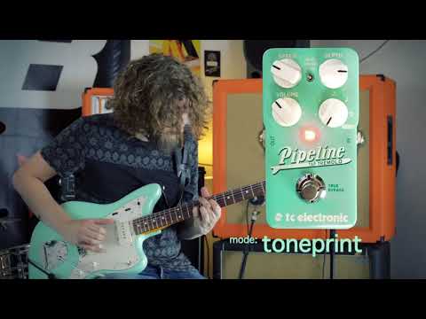 Highly customizable tremolo pedal with vintage and contemporary sounds, Tap Tempo, Volume Boost and Tone Print Technology. The new Pipeline Tap Tremolo is a highly anticipated Tone Print enabled tremolo pedal. With Pipeline at your feet, you\'ll have access to the warm, organic sounding sinus curves of the sixties, the jagged edge rotor blade clippings reminiscent of helicopter landings and everything in between. Whether you\'re looking for a classic surf sound or the syrupy wobble of the Motown era, the vintage mode has got you covered, while the square mode yields a more aggressive and edgy contemporary sound. Of course, you can always use the Tone Print mode to custom tailor Pipeline Tap Tremolo and make your own waves. With up to 6 dbs. of volume boost on tap, Pipeline lets you eliminate the perceived volume drop inherent in tremolo effects and make weak sounding tremolo passages a thing of the past. After selecting 7 different modes of rhythmic subdivision, use the footswitch to tap the tempo and you\'re good to go.